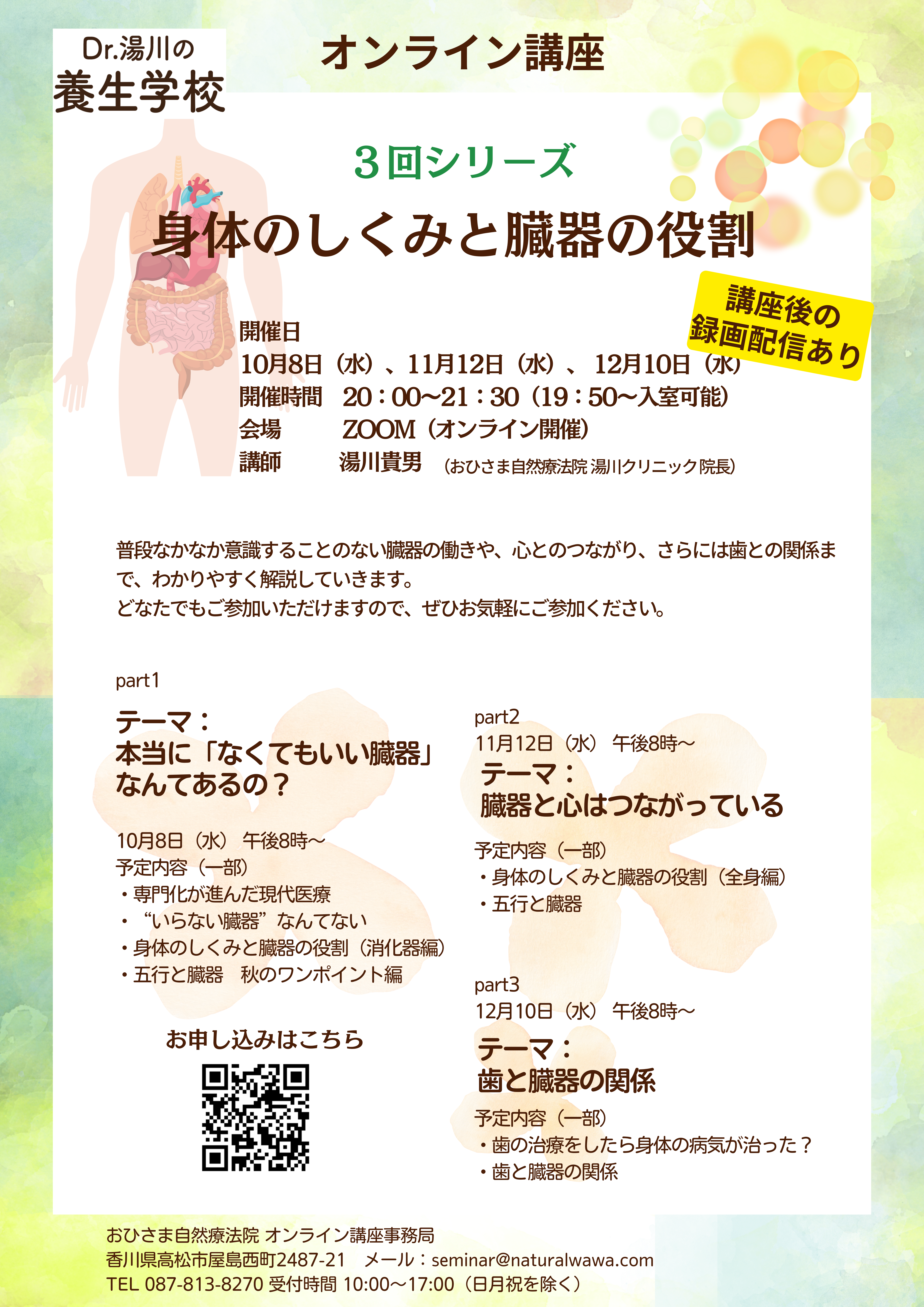Dr.湯川の養生学校では、毎回のお手続きなしで学べる「定期受講コース」をご用意しています。詳細は以下よりご覧ください。
