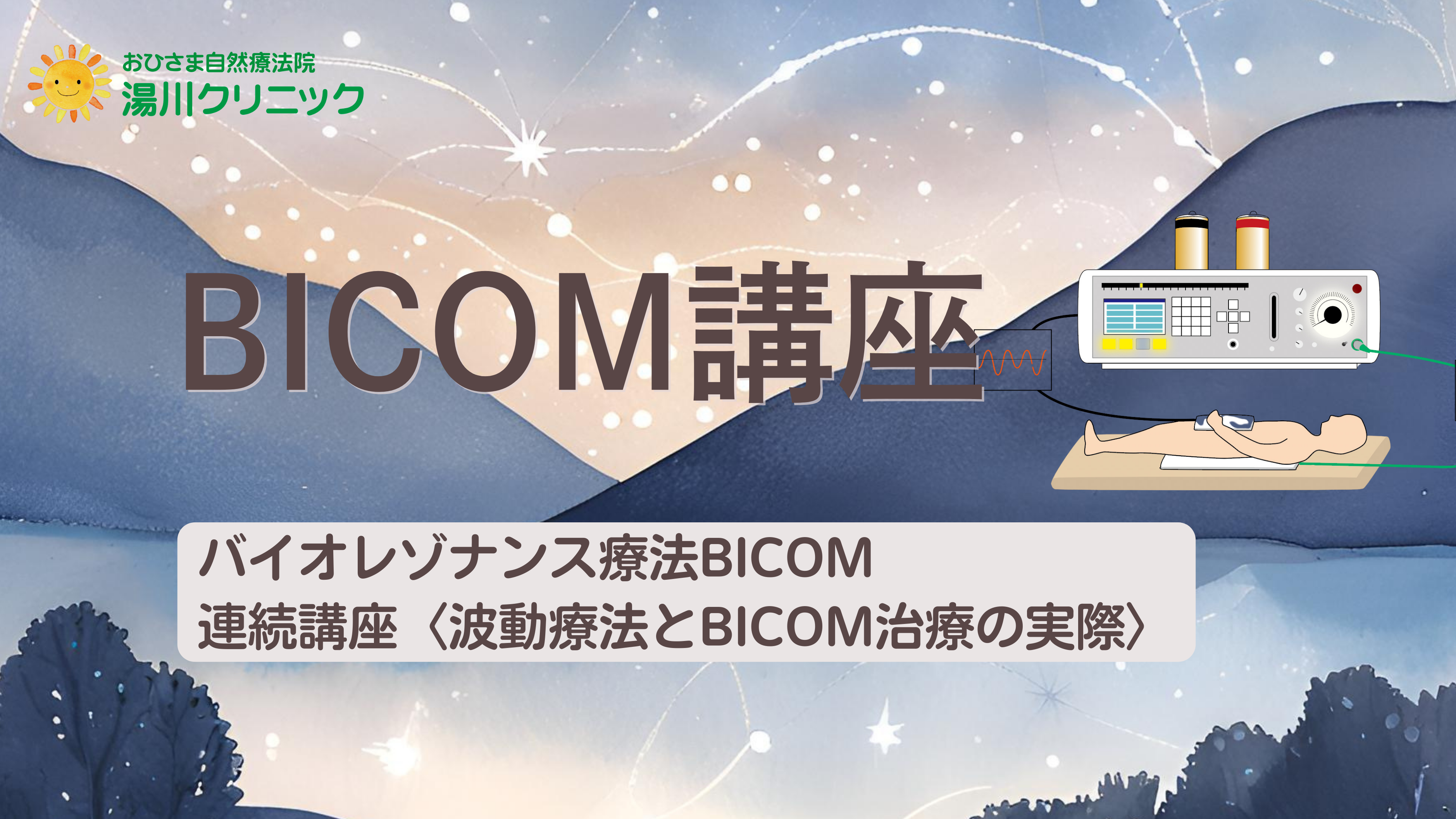 本講座は、湯川クリニックが主催し、BICOMの日本国内での理解と普及を目的として、個人的に開講しているものです。資格取得を目的としたものではなく、修了により公的または民間の資格が付与されるものではありません。あくまで学びの場として、BICOMに関心をお持ちの方々に向けて情報共有・理解促進を目的としています。